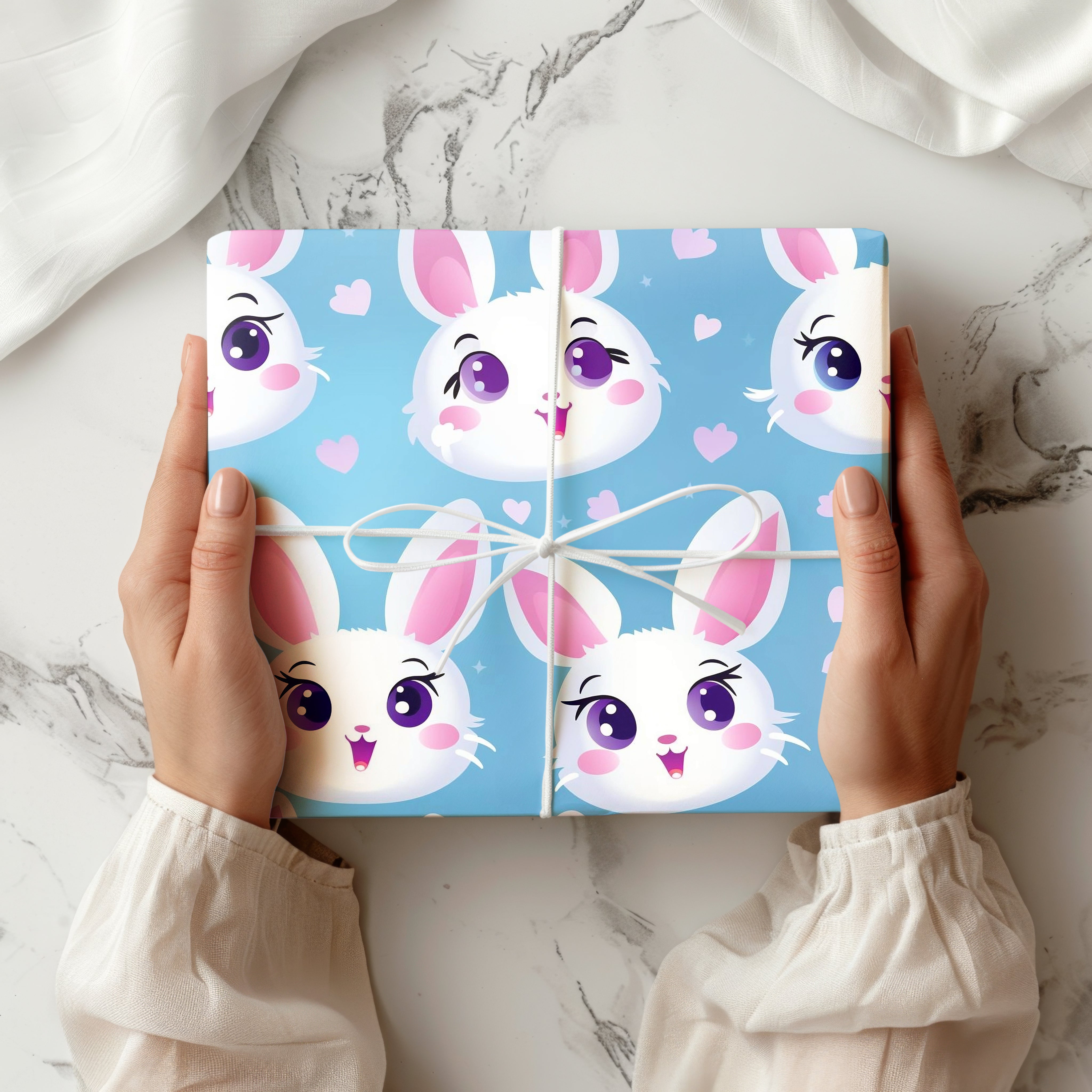 Cute Bunny Wrapping Paper Sheet – Adorable Kawaii Rabbit Gift Wrap for Girls' Birthdays or Easter, Blue