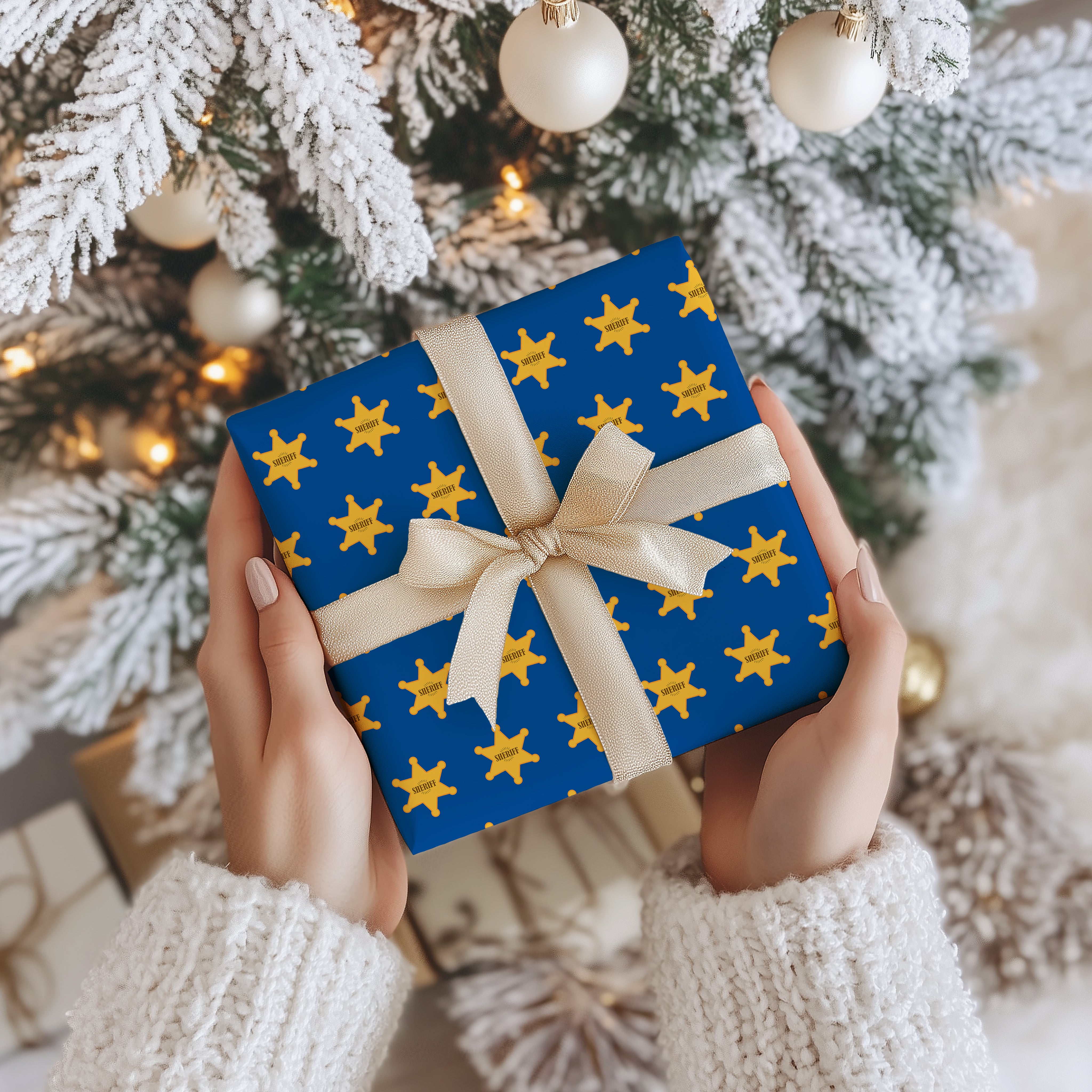 Sheriff Badge Wrapping Paper Sheet – Western Star Design Gift Wrap for Cowboy Parties or Christmas, Royal Blue