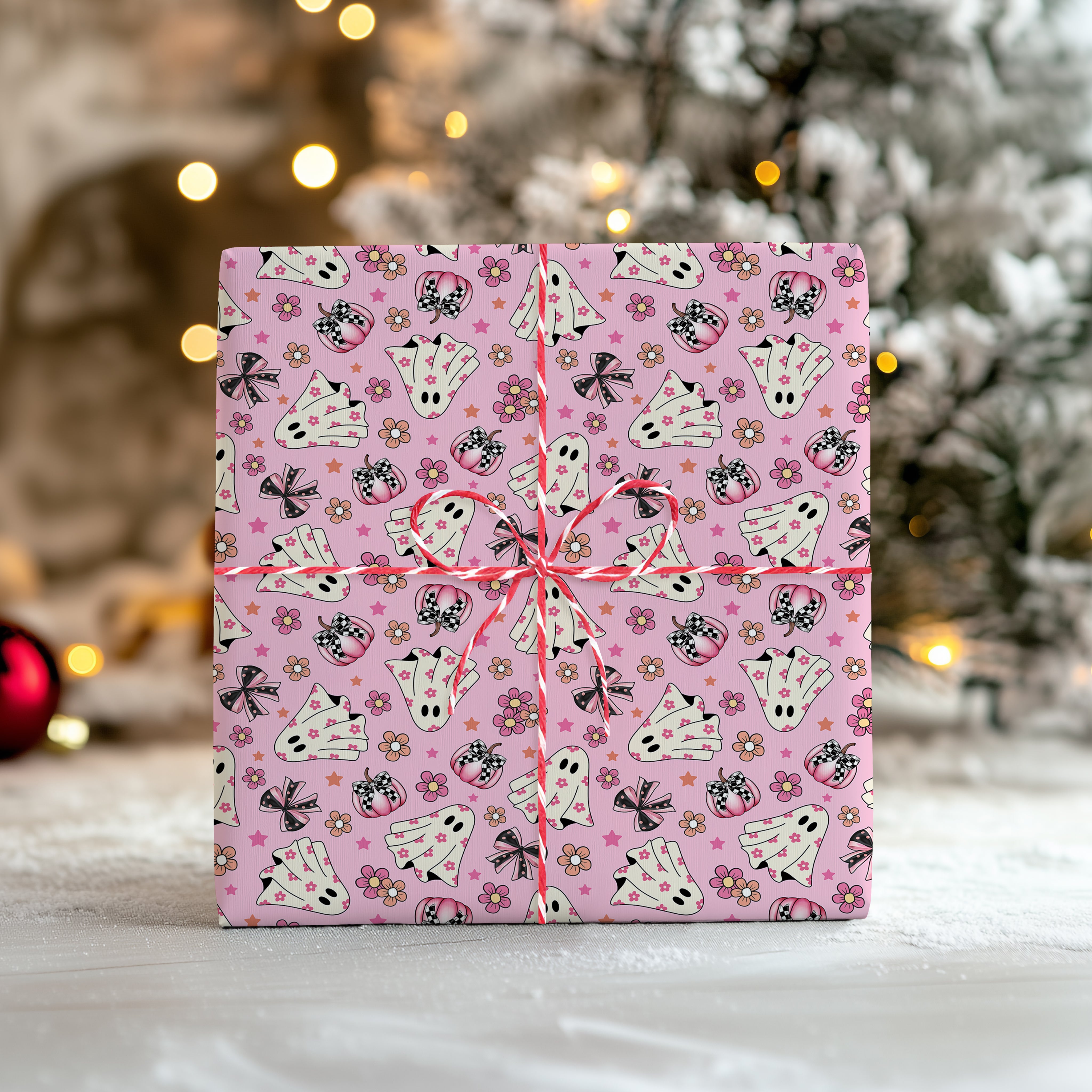 Cute Ghost and Skull Wrapping Paper Sheet – Pastel Spooky Gift Wrap for Halloween or Alternative Birthdays, Pink