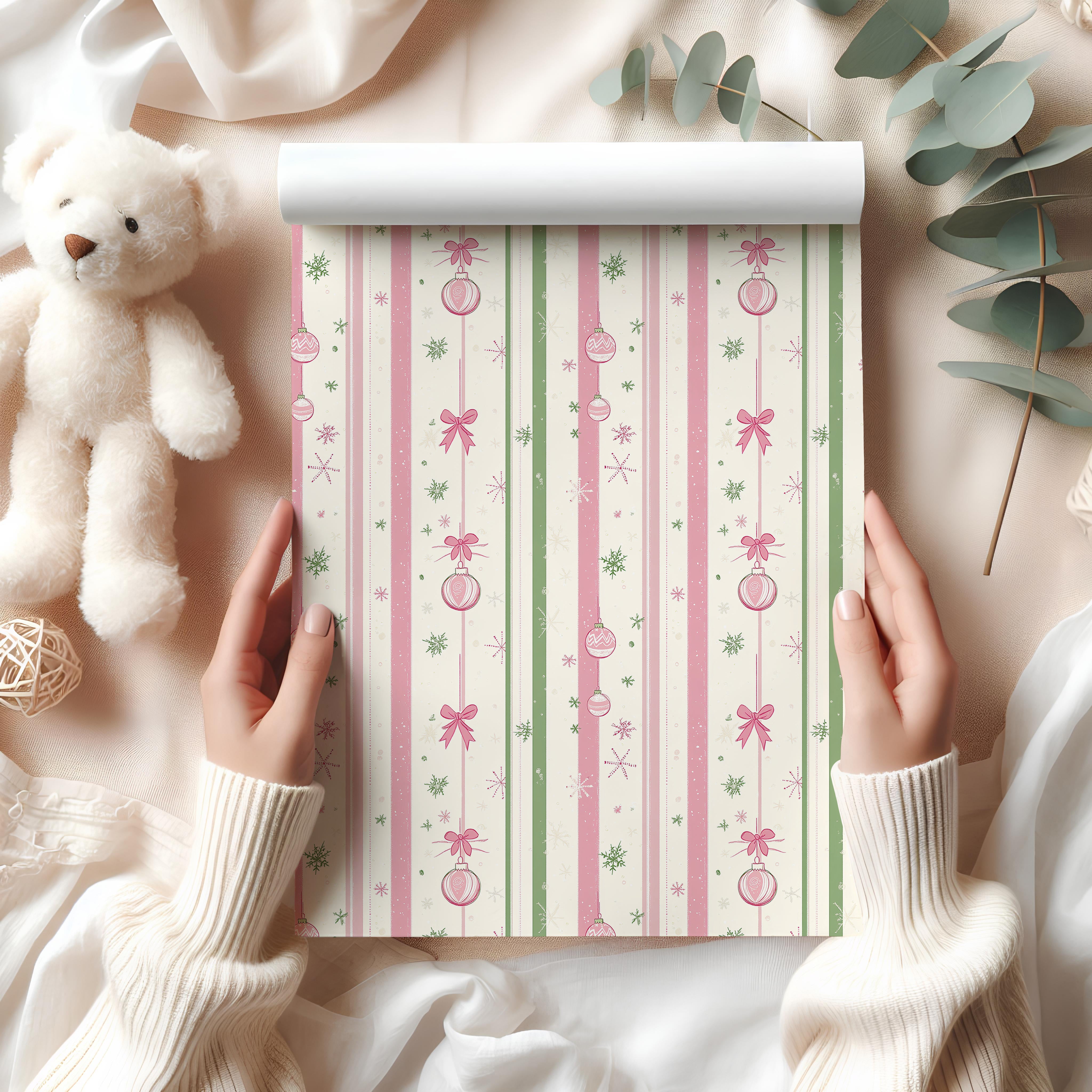 Pastel Stripe Christmas Wrapping Paper Sheet – Pink and Mint Festive Gift Wrap with Ornaments and Bows, Multicolour