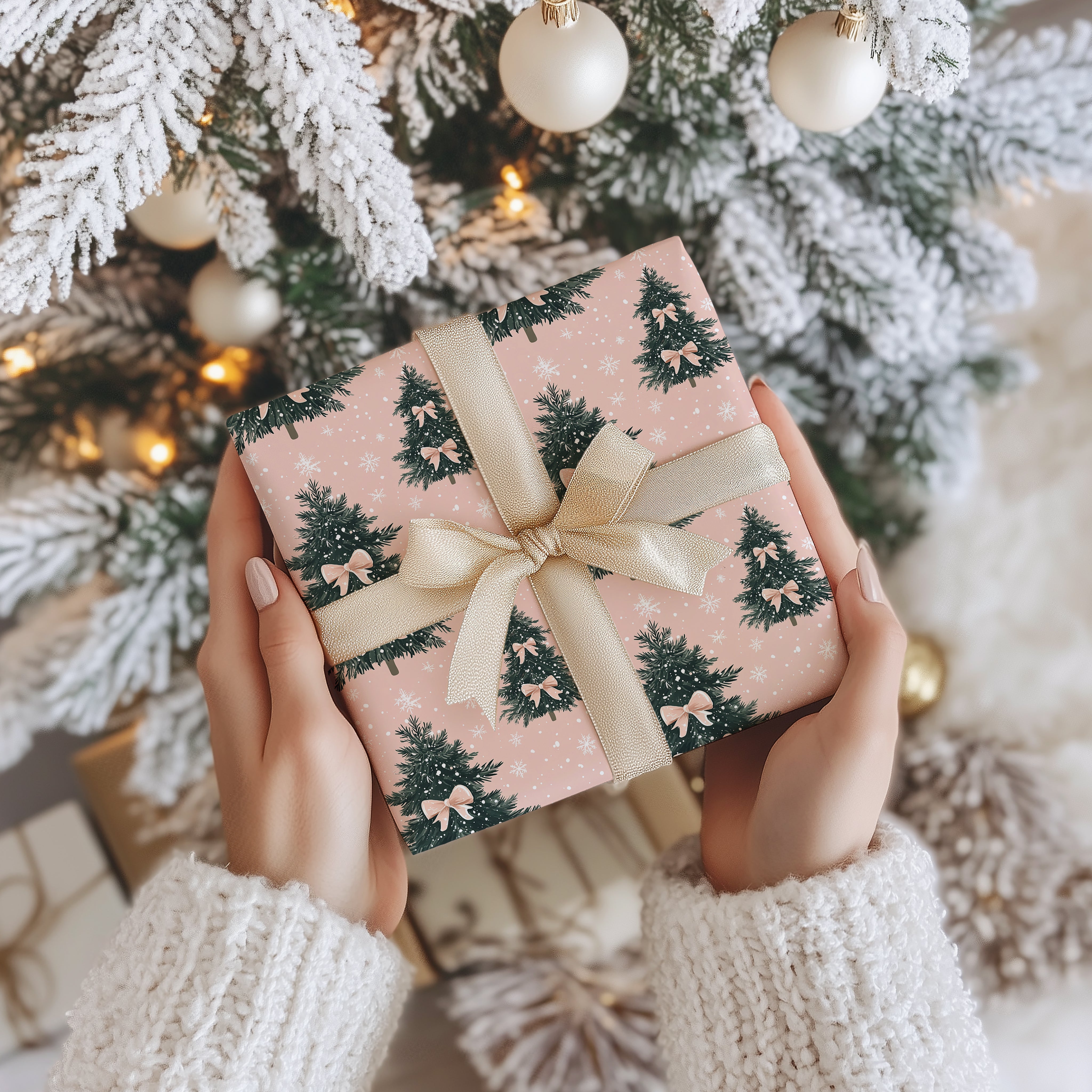 Pink Christmas Tree Wrapping Paper Sheet – Cute Pastel Festive Gift Wrap with Bows and Snowflakes, Blush Pink
