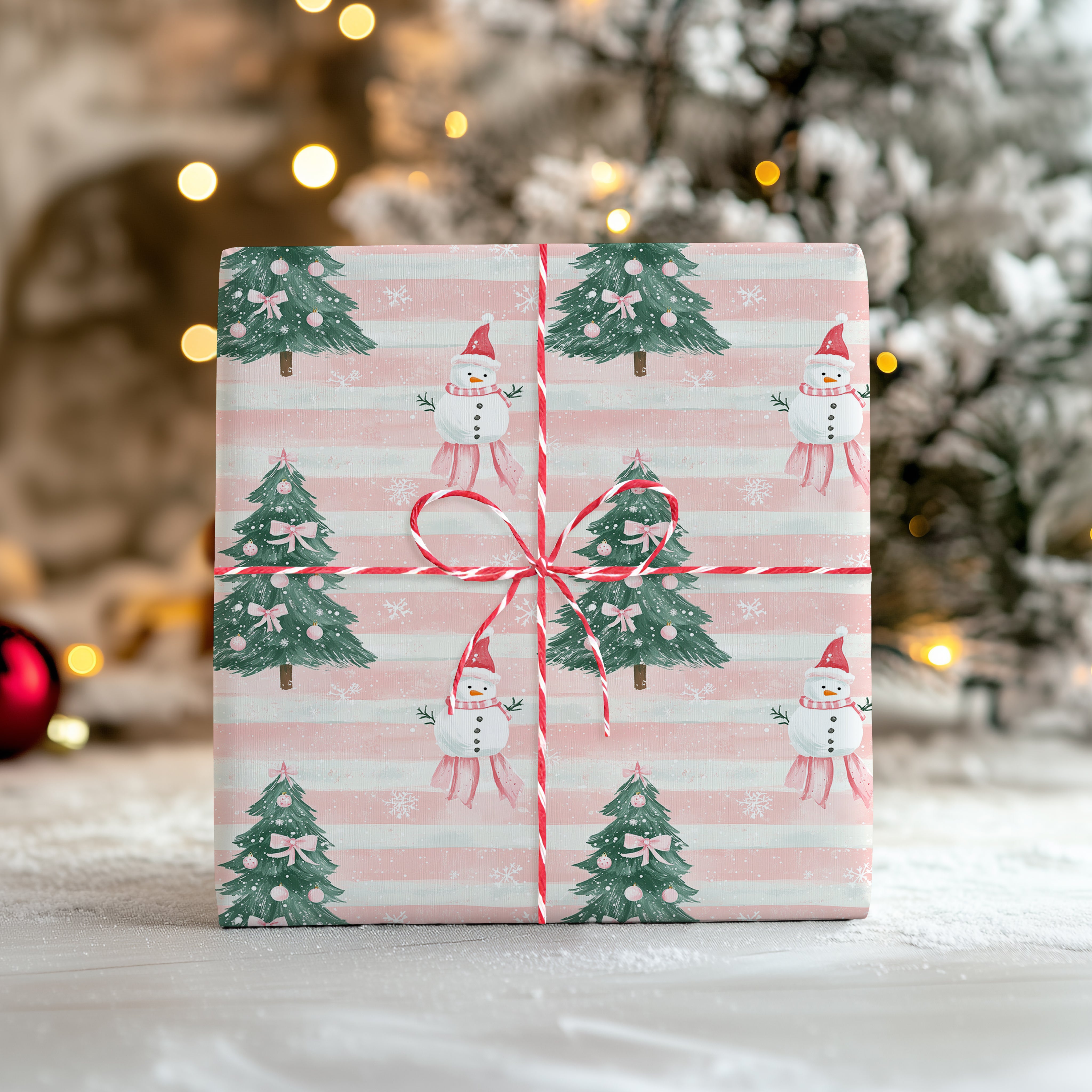 Cute Snowman Christmas Wrapping Paper Sheet – Pastel Stripe Gift Wrap with Trees for Festive Gifts, Blush Pink
