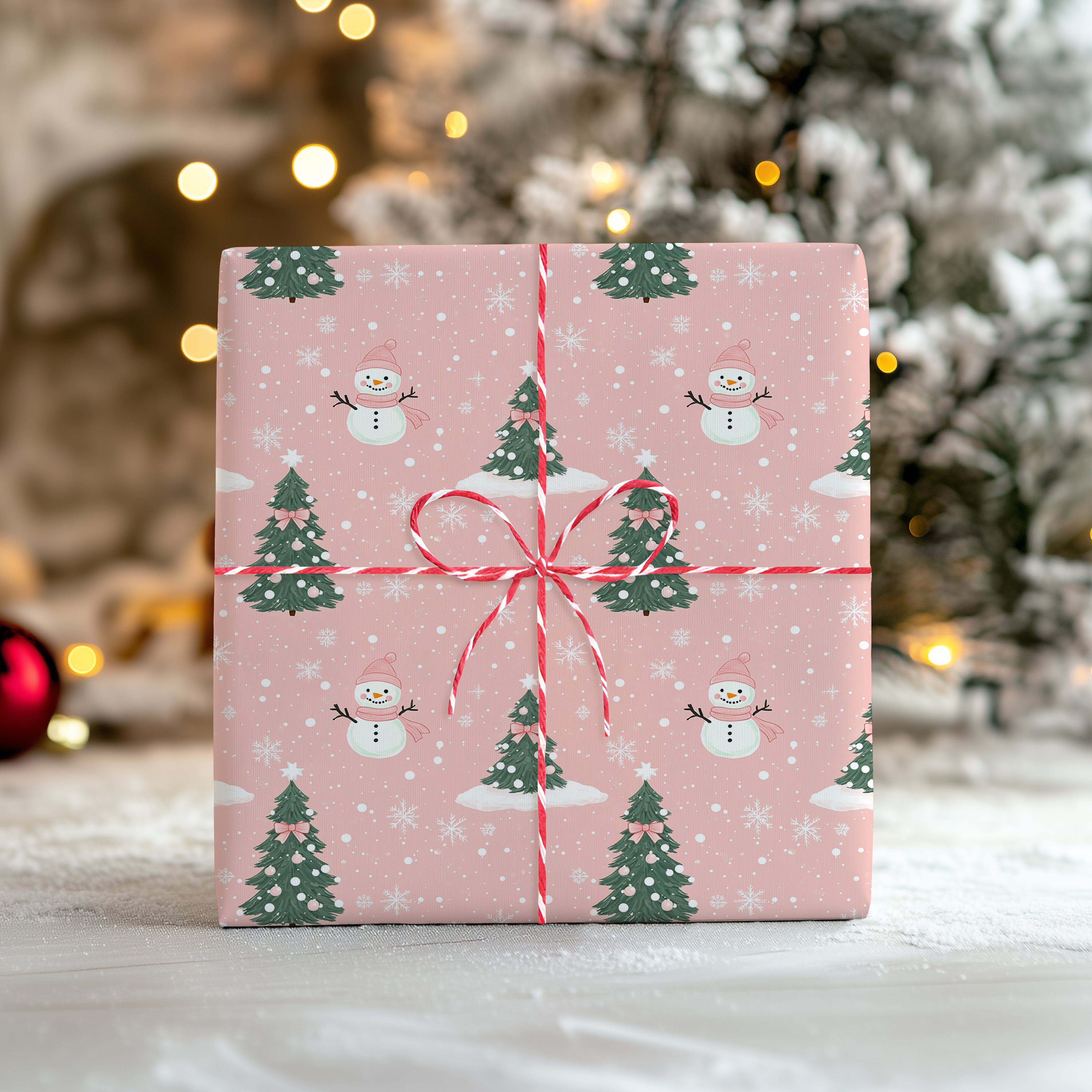 Cute Snowman Christmas Wrapping Paper Sheet – Pastel Pink Festive Gift Wrap with Snowflakes and Trees, Blush Pink