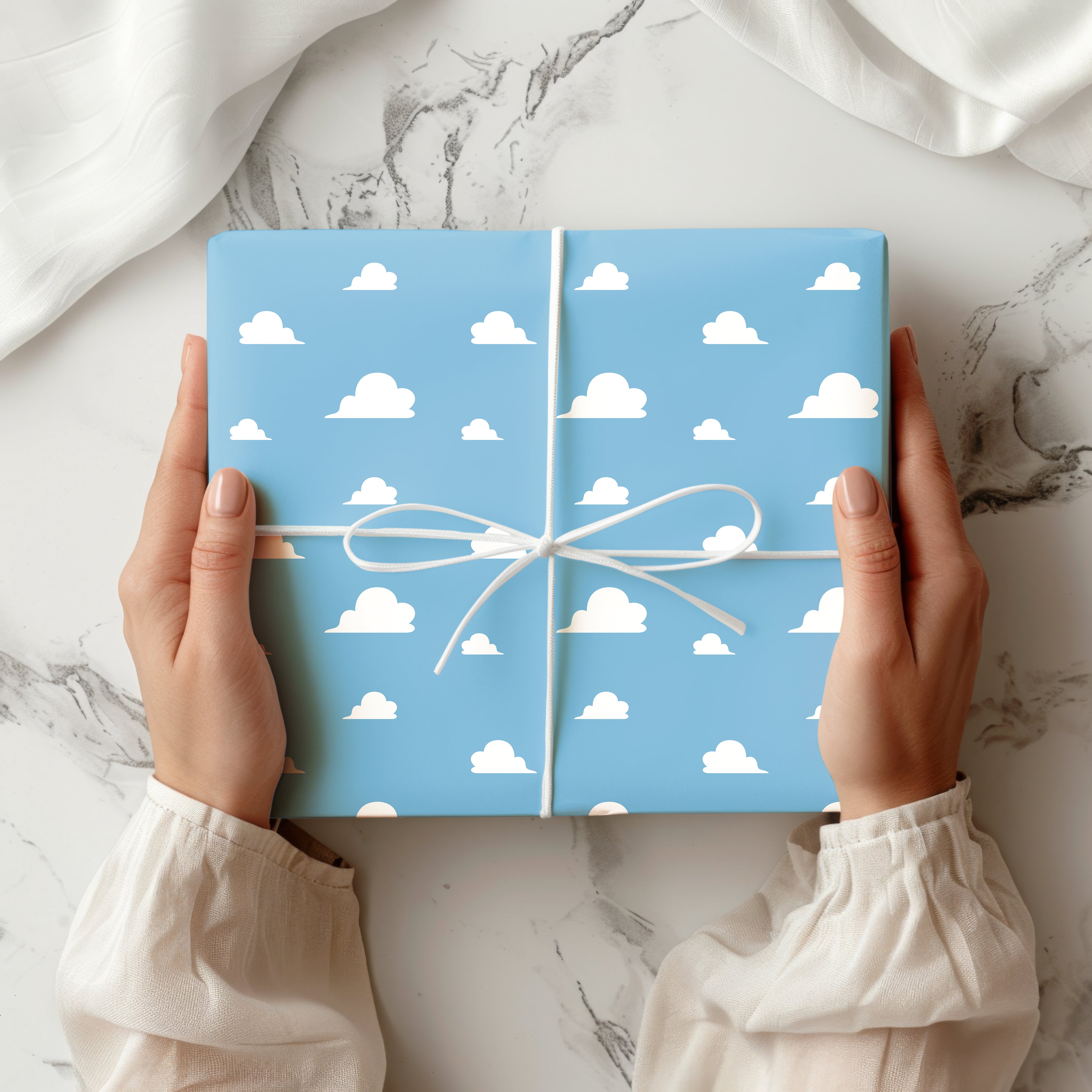 White Cloud Wrapping Paper Sheet – Cute Sky Design Gift Wrap for Baby Showers or Kids' Birthdays, Blue