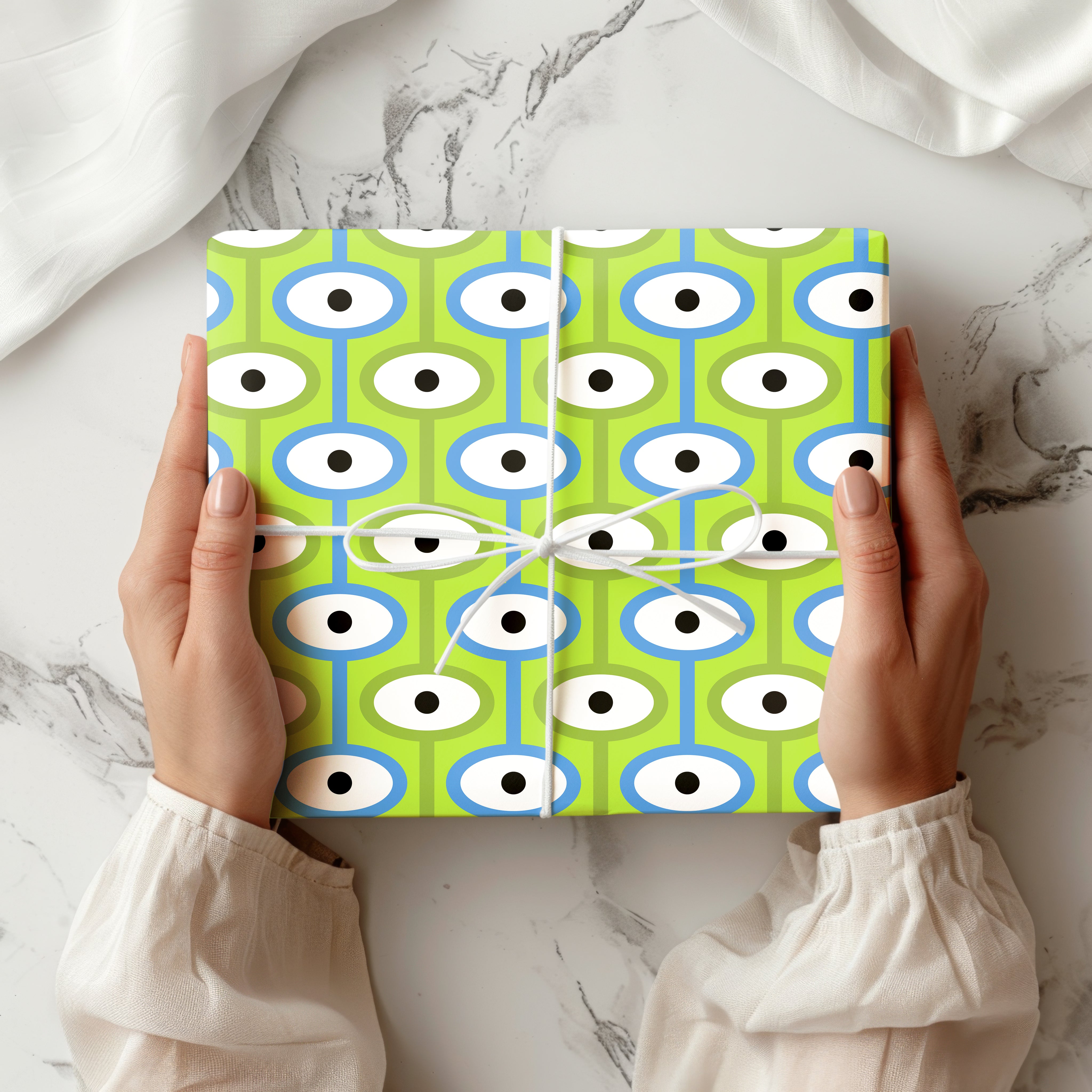 Retro Geometric Wrapping Paper Sheet – Mod Mid-Century Eye Pattern Gift Wrap for Birthdays, Lime Green